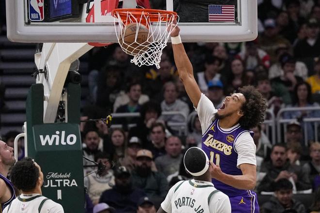 下半场易边再战,第三节上来字母哥先篮下杀一个,东契奇造犯规罚球,里夫斯也强硬打进。但场上风云突变,格林三分三连击,雄鹿打了一波15-0的小高潮追到16分。东契奇罚球止血,然后艾顿连续吃饼又把分差拉开到了20分以上,雄鹿暂停。暂停以后,字母篮下继续翻江倒海,里夫斯中投回敬以后,格林第5记三分!东契奇和字母各自造犯规罚球,字母哥篮下连续打进,安东尼抢断以后,波蒂斯反击追到只差14分。东契奇连续两记三分外加一个抛投,连得8分稳定军心。三节结束湖人92-72领先20分。