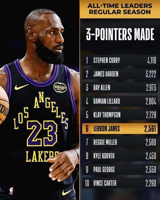 詹姆斯在次节登场9分41秒,他在场上以组织串联为主,但一度接连命中两记三分,终于打破运动战进球荒。上半场詹姆斯4中2均是命中三分,外加罚球2中1,得到7分2篮板4助攻,生涯三分命中数已经达到2561记三分,超越名宿雷吉-米勒2560记三分,升至NBA历史三分榜第6位迎来里程碑。 詹姆斯在下半场状态继续提升,他第三节出场7分11秒,单节再得4分从而得分上双,让他连续得分上双历史第一纪录提升到连续1293场。