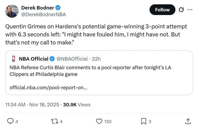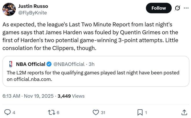 裁判报告出炉!漏判哈登三分绝杀 快船两度吃亏
