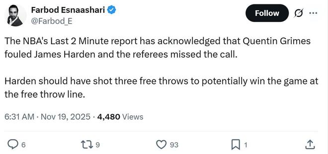 值得一提的是,裁判并不是仅漏判这一次,最后2分钟除了这一次三分绝杀被打手漏判之外,裁判还先后漏吹了祖巴茨与庄神的防守三秒犯规,这意味着,最后2分钟时间里,快船队2度吃亏。 快船队记Farbod Esnaashari吐槽道:“哈登本应获得三次罚球机会,并且有机会通过罚球完成绝杀。”