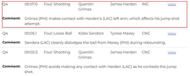 这一幕发生在比赛最后还剩7秒时,快船队落后2分,泰伦卢叫了暂停后,为哈登安排了一个一对一单打的战术,哈登通过节奏变化拉开出手空间后直直跳起出手三分,试图补防的格莱姆斯直接打到哈登的手肘,结果裁判并没有表示,也没有进行回看。