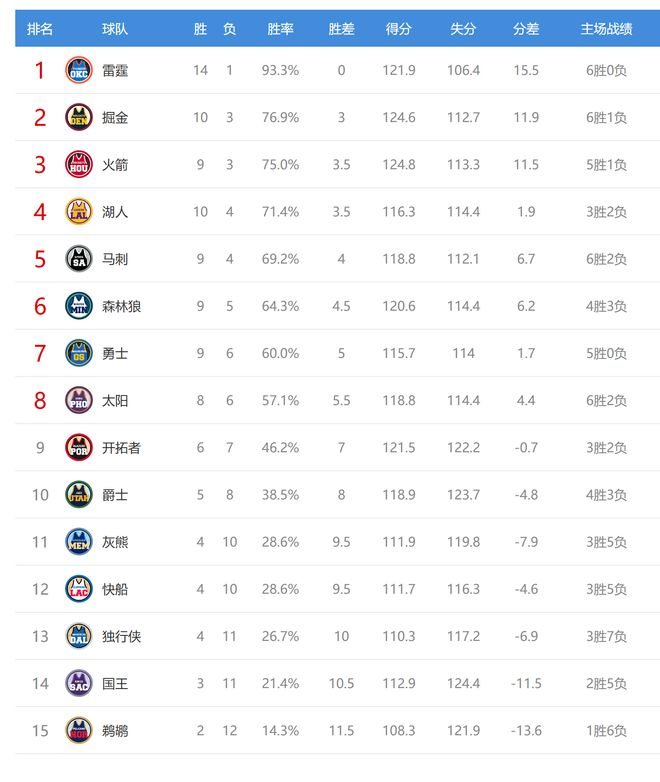 快船输球后4胜10负,排名从西部第11掉到第12,灰熊成为第11,快船近8场比赛输了7场,他们的处境非常艰难。 今日比赛后西部球队中只有快船、灰熊排名互换,其他球队排名不变。