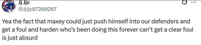 “马克西只要顶撞我们的防守队员就能造犯规,而哈登一直以来都是这么做的,却总是造不出明显的犯规,这简直太荒谬了。”