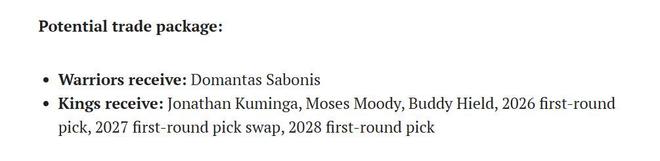 为此,美媒《SI》送给勇士队一笔6换1交易支招,认为勇士队可以打包库明加、穆迪追求小萨博尼斯打造库里+小萨+巴特勒+追梦的4巨头,具体交易内容如下: 勇士得到:小萨; 国王得到:库明加+穆迪+希尔德+26年首轮+27年首轮互换+28年首轮。