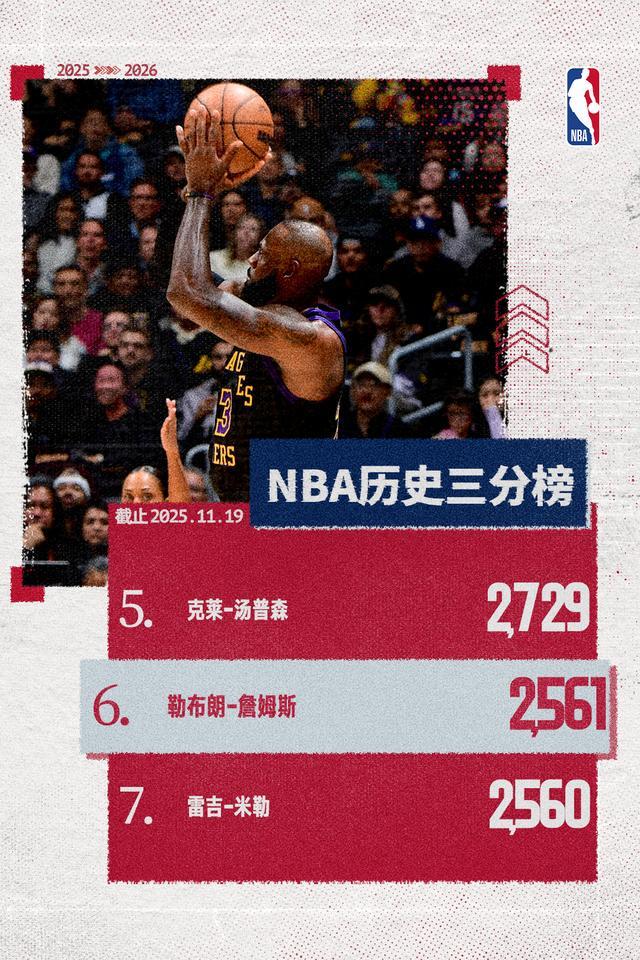 在比赛第二节,詹姆斯急停跳投三分命中,生涯三分命中数达到2561,超越雷吉-米勒,升至历史第六位。 三分榜历史前五名分别是:库里、哈登、雷-阿伦、利拉德、克莱-汤普森。 (NBA官网) |