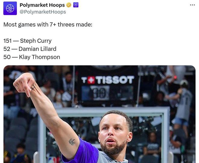 同时本场是库里生涯第151次单场至少命中7记三分,继续断层高居NBA历史第一,第二为利拉德(52),第三为克莱(50)。 过去4场比赛库里场均要拿下34.5分4.3篮板4.8助攻1.8抢断全能数据,三项命中率高达50.6/40.7/88.2%、40.7%和88.2%。 这还是在前一场对阵鱼腩鹈鹕仅拿9分情况下的平均数据,另外三场比赛库里分别交出46分、49分和34分。