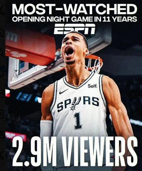 文班缺席,除了极大影响马刺的战绩外 也会波及到目前联盟涨势喜人的收视率 文班的比赛更是目前NBA“当家花旦级” 夸张到全美直播收视率,同比暴涨92%