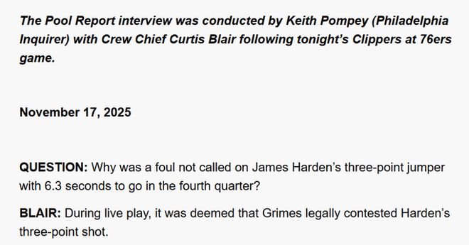 记者提问:“第四节还剩6.3秒时,詹姆斯-哈登的三分出手为何没有被判罚犯规?” 裁判布莱尔回应道:“比赛直播过程中,裁判判定格雷姆斯对哈登的三分出手进行了合法干扰。”