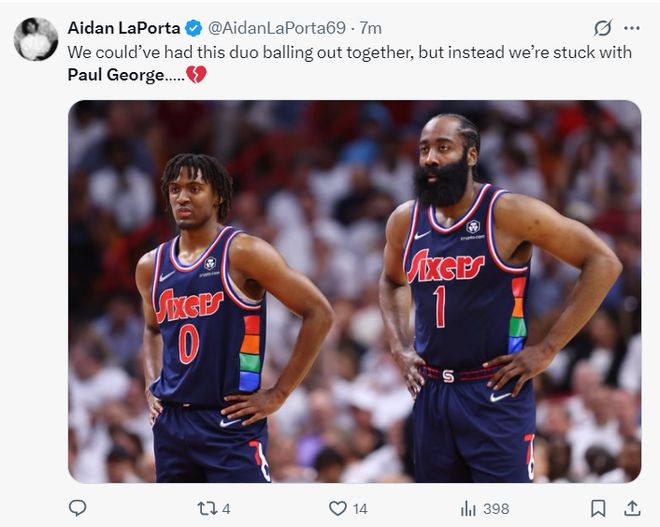 费城媒体Aidan LaPorta写道:我们本可以继续看到马克西+哈登的盖世表演,可如今我们只能看保罗-乔治,太心碎了。 |