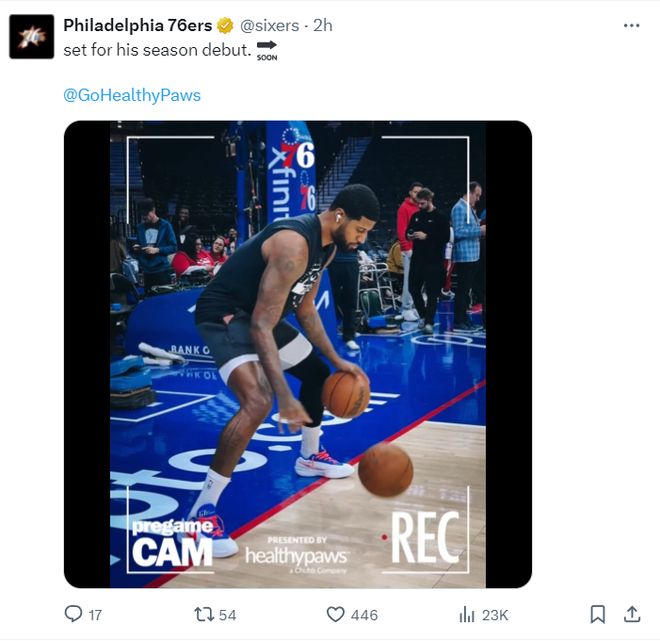 赛前费城晒出了乔治热身的视频,乔治的左腿还是穿着弹力裤,乔治的身材似乎比上赛季末要更瘦一点,乔治进入新赛季更自律对于费城来说是巨大的利好。