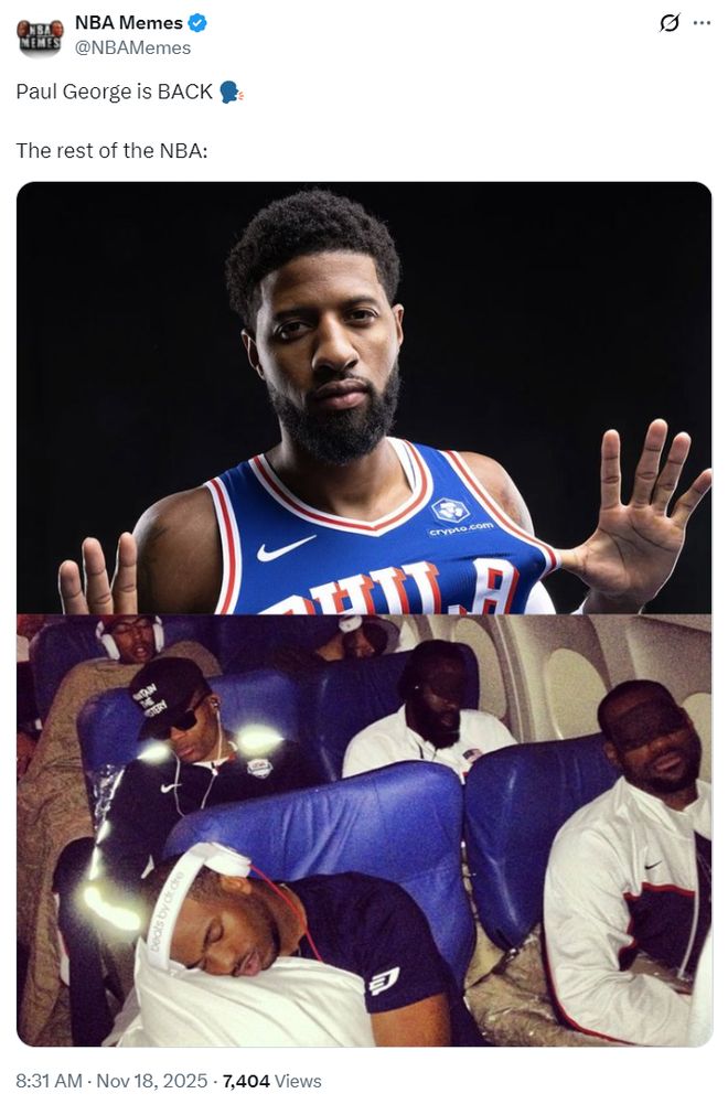 虽然乔治复出了,但美媒NBA Memes还是嘲讽他:乔治回归了,联盟其他的球队都在睡觉。这说明大家都已经不觉得乔治是一个球星。