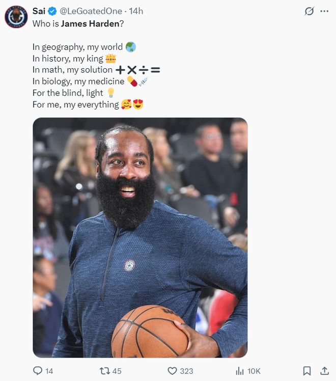 快船媒体:为什么没有人去谈论哈登惊人的巅峰呢? 詹姆斯-哈登是谁? 在地理课上,那是我的世界 ; 在历史课上,那是我的国王 ; 在数学课上,那是我的解法; 在生物课上,那是我的药物; 对于盲人,那是光明; 对我而言,那就是我的一切; |