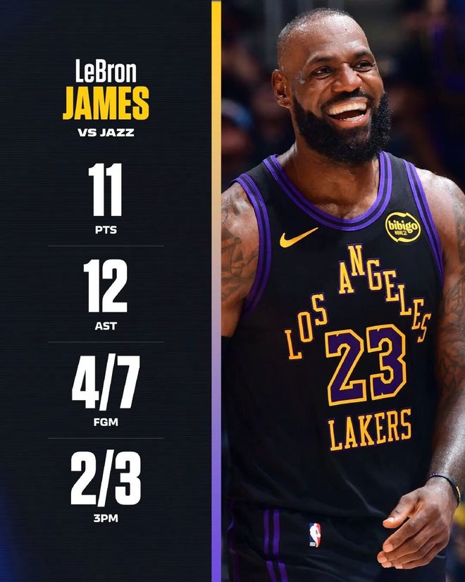 让我们看看归来的詹姆斯,怎么融入当今的湖人?首发出战约30分钟,仅出手7次,得到11分外加送出全队最高的12次助攻,并没有抢任何人的风头,甚至心甘情愿专注于辅助。