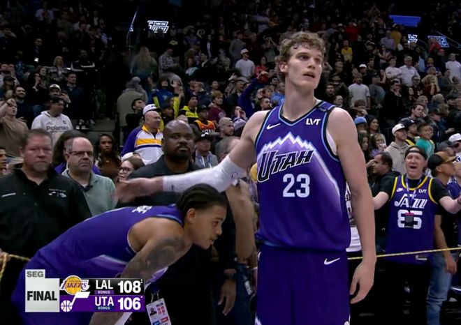 后面他第2次起身再去接绝杀的时候,湖人队的防守球员就已经到位了,这是爵士队教练很不满意的一点,觉得自己的球员在投篮之前都被抱摔在地上了,如果没有被干扰,他难道完不成这次绝杀球吗?当场急眼了。所以赛后爵士队的主帅站在场地中央直接找裁判喊冤,一直都不愿离开,因为他很清楚,这场球他们到最后一秒都是有机会拿下的。 |