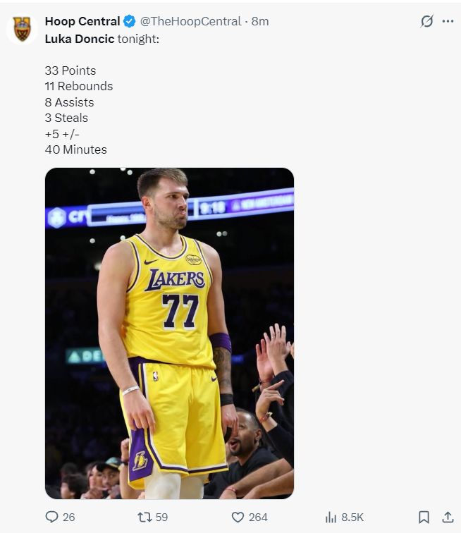 全场比赛东契奇40分钟,24中10,三分12中3,罚球12中10,拿到33分11篮板8助攻6失误3抢断,命中率41.7%,三分命中率25%,外线手感奇差。 |
