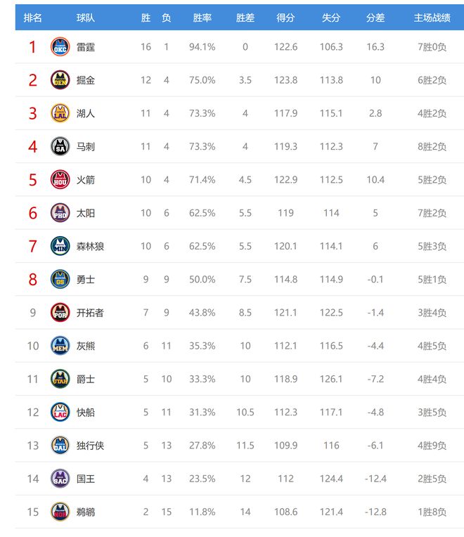 灰熊赢球后2连胜,战绩6胜11负,排名从西部第11升到第10,爵士变成第11,独行侠输球后5胜13负,继续排名西部第13。 今日比赛后灰熊、爵士排名互换,其他西部球队排名不变。