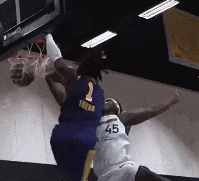 太猛了,太猛了。 湖人25届次轮第6号秀蒂耶罗,在G联赛空接扣翻对手。