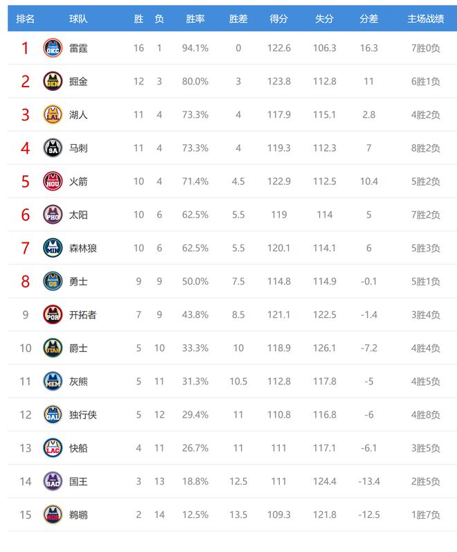 雷霆赢球后取得8连胜,战绩16胜1负高居联盟第一,雷霆拥有历史顶级防守,容错率太高。爵士输球后5胜10负排名西部第10。 今日比赛后湖人、马刺、火箭、太阳、森林狼排名互换,快船、独行侠排名互换,总计7支球队排名互换。