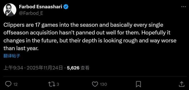 附加赛变奢望 而在本场比赛开始前,快船队记Iliyan Lakhani刚刚发布长文爆料,在经历惨淡的开局后,快船队内部达成一致,本赛季的目标是力拼附加赛名额。 期间球员们将保持谦逊,教练组也将调整战术,同时管理层计划在交易截止日前有所调整。 加上球队距离爵士、灰熊、开拓者和勇士等潜在竞争者的战绩差距不大,快船队的赛季最终目标是力争8-10名,但4大因素让这支名单看似豪华的快船想要竞争附加赛都变成奢望,换帅几乎成为唯一出路。