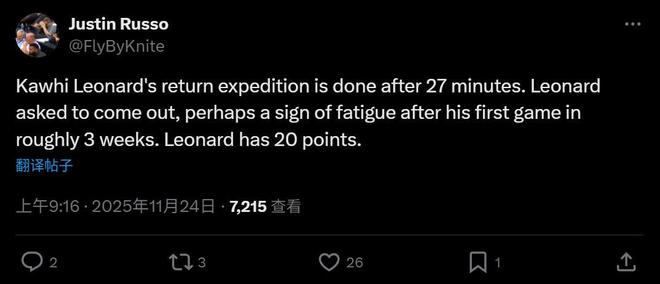 本场赛后快船随队记者Justin Russo又曝出,小卡本场仅出战26分钟并非是教练组刻意安排,而是小卡自己主动要求下场,他看起来有些不适,径直走下场后在场边独自拉伸了一下。 作为对手的骑士队记Justin Rowan对此解释道:“小卡在下场前,意外被队友科林斯狠狠撞了一下膝盖。” 除了如此脆皮的小卡之外,比尔赛季已经报销,重要轮换小琼斯也因伤缺席数场比赛。