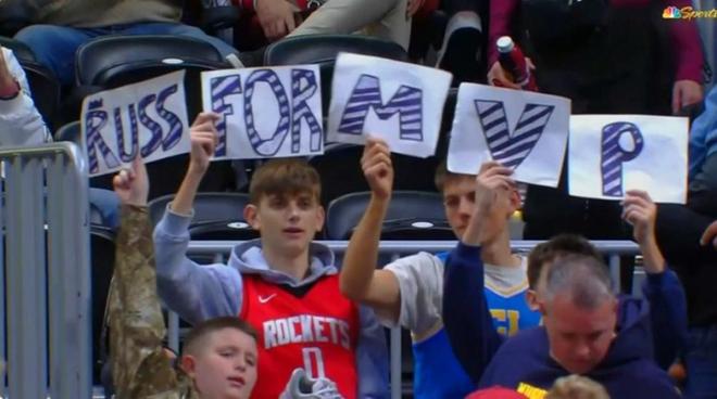 而这也是威少本赛季加盟国王获得更大角色后傲人表现的缩影,过去5场比赛场均拿下13.2分8.6篮板8.4助攻1.2抢断,三分命中率37%。 面对本场比赛末节梦回巅峰的威少,现场身穿威少火箭时期0号球衣的小球迷也举起威少MVP的牌子。 威少也用本场比赛的表现再次证明,状元可能会有水货,但MVP绝对不会有水货。