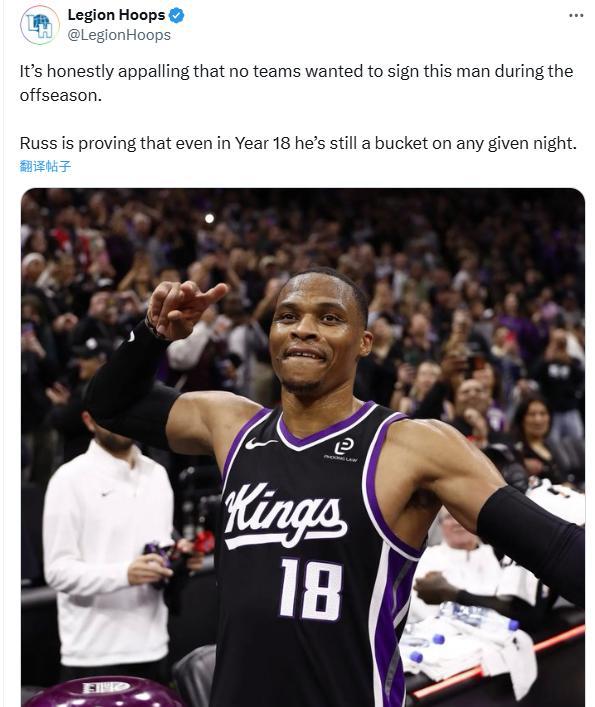 美媒Legion Hoops也感慨道:“实话实说,很难相信休赛期没人愿意签约威少,这太令人震惊了,威少他用实际行动证明,即便是在生涯第18个赛季,他依旧可以在任何一个夜晚得分。”