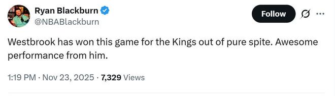 威少这样的表现也为自己赢得对手尊重,掘金记者Ryan Blackburn发文到:“威少展现出强烈的赢球意志,率领国王队拿下这场胜利,他的表现真的是太棒了!”