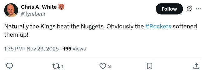 火箭送神助攻 正如赛后火箭记者Chris A. White所说,掘金队不出意料爆冷输给了国王队,因为昨天火箭队大大消耗了掘金队。 本场对阵威少率领的国王队是掘金队背靠背第二场,前一场掘金队与火箭队鏖战至最后一刻才拿下强强对话,本场掘金全队体能与状态明显受到影响。