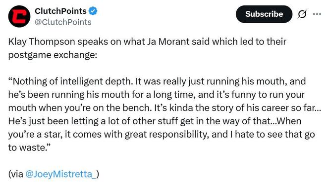 谈到自己与莫兰特的口角时,克莱说道:“他只会胡说八道,并且一直以来都是如此,坐在替补席上胡说八道真得很滑稽,这几乎是他职业生涯至今的写照。” “我们都希望看到他上场打球,发挥最佳水平,但他总是被各种各样的事情分散注意力,我不希望看到他的天赋被浪费掉。” 过去几个赛季莫兰特频繁被禁赛,22-23赛季因直播炫耀手枪被禁赛8场、23-24赛季因为同样原因被禁赛25场、本赛季因为与教练发生冲突又被内部禁赛一场。