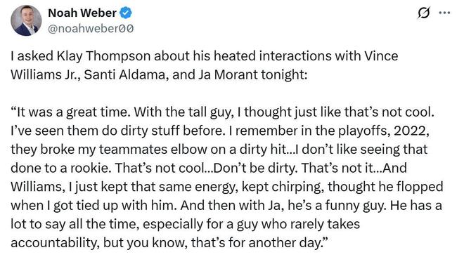 面对年轻的弗拉格被对手如此恶犯欺负,作为老将的克莱自然无法忍受,直接入场对着灰熊队和阿尔达马一顿输出。 赛后克莱接受独行侠记者Noah Weber采访时也解释了为何自己如此气愤:“他们太不厚道了!我以前就见过他们这种肮脏的动作,我记得是22年的季后赛,他们用一个很脏的动作把我队友的胳膊弄骨折了,我不喜欢看到这种事情发生在一名新秀身上,这太不厚道了,也太肮脏了。”