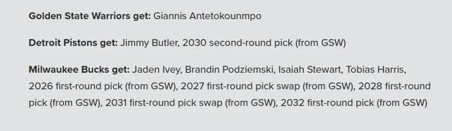 话说,美媒《BR》倒是有与众不同的想法,前不久策划了一笔3方交易方案,具体如下: 勇士得到字母哥;活塞得到巴特勒+30年次轮签;雄鹿得到艾维+波杰姆斯基+斯图尔特+哈里森+26年首轮签+27年首轮签互换权+28年首轮签+31年首轮签互换权+32年首轮签。
