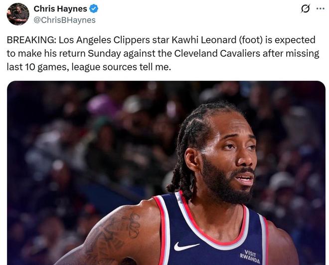 小卡敲定回归日期 在哈登爆砍55分带队取胜结束连败之际,名记Haynes也送来好消息,已经因伤连续缺席10场比赛的小卡预计将在周一对阵骑士的比赛中复出。 对于36岁的哈登和内外交困的快船队来说,没有什么是比小卡即将复出更好的消息了。