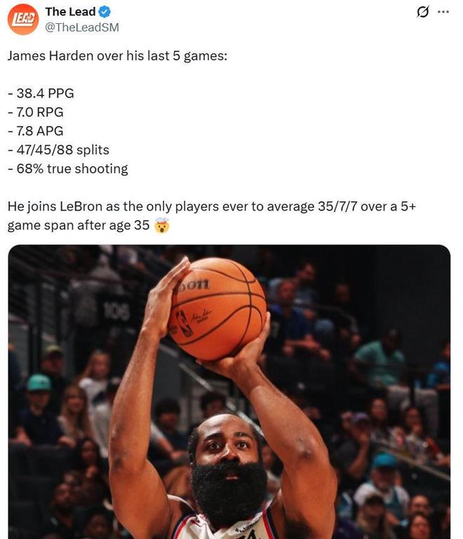 并且哈登这样的表现并非是昙花一现,而是其开季至今傲人表现的缩影,开季至今场均轰下28.4分,是哈登2020年在火箭队拿下得分王后场均得分新高。 在小卡持续因伤缺席,比尔又赛季报销后,单核率领快船队的哈登进一步暴走,过去5场比赛场均轰下38.4分,合计5场比赛拿到192分,此前NBA历史上从没有球员能够在36岁之后连续5场交出这样的表现。 此前保持类似纪录的球员是詹姆斯,他曾连续5场场均38分,总计拿到190分。