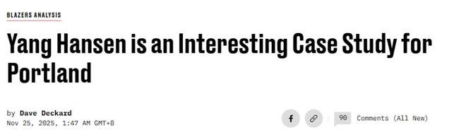 这位球迷写道:“能不能告诉我开拓者队或者其他人看中杨瀚森什么了?我实在看不出来他的价值。他还没准备好打NBA。看看今年其他新秀,好多都已经能为球队做贡献了,但瀚森呢?我还不想用‘水货’这个词,但已经忍不住摇头了。” Deckard的详细解读如下: 首先,我们来肯定你观点中的合理之处—— 杨瀚森的出场时间确实很少:8次出场场均仅8.5分钟; 表现也不尽如人意:投篮命中率仅32.3%,每回合篮板数据平淡,传球本是他的核心优势之一,但在生涯初期,他的助攻失误比几乎持平(毫无亮点); 与开拓者队当初选秀顺位相近的其他新秀(尤其是11号秀考沃德和13号秀奎因),目前的贡献已经超过了瀚森。 但说真的,要是仅通过68分钟的总出场时间就能断定杨瀚森的未来,那你的球员评估能力可比我强多了。