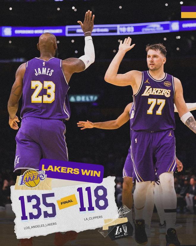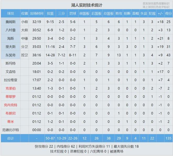 艾顿今天休战,祖巴茨面对海斯,居然占不到便宜。第二节湖人32-28单节净胜4分,半场战罢,湖人69-66领先快船。东契奇半场32+3+6,哈登16+4+5。易边再战,湖人依然压制快船。湖人防守端死掐哈登这一点,小卡隐身了。 三节打完,湖人98-93领先5分,东契奇前三节已经轰下37+8+8。原本以为双方能打到最后一刻,结果湖人一波14比4领先到两位数。末节最后3分半,湖人仍然领先10分。邓恩抢篮板推倒东契奇,海斯替队友出头,双方爆发冲突。 邓恩被直接驱逐,海斯吃了个技术犯规。比赛已经没悬念了,全场结束,湖人135-118大胜快船。湖人双喜临门:重返西部第二;小组出线,锁定NBA杯的淘汰赛资格。东契奇43分9板13助、里夫斯31分9板3助、詹姆斯25分6板6助。