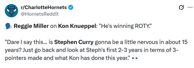 目前的新秀三分纪录由国王的基根-穆雷保持,是206个,随后是米切尔(187个)、利拉德(185个)和布兰登-米勒(184个)。美媒表示,克努佩尔有望成为下一个斯蒂芬-库里,他完全配得上这样的赞誉。 NBA名宿雷吉-米勒也在最新的播客节目上谈到了克努佩尔:“他肯定能当选最佳新秀,再过15年,库里会不会有点紧张?”