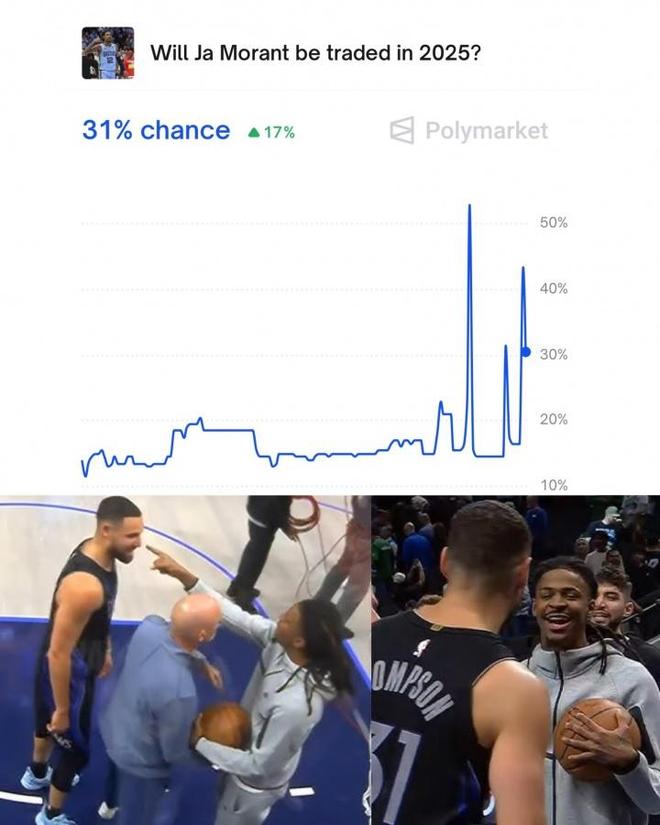 看到这样的场景,不少人都在摇头叹息。莫兰特如此冲动的行为,实在是让人难以理解。克莱在联盟中征战多年,积累了无数的荣誉和口碑,是后辈们应该尊重和学习的对象。即便莫兰特可能是想以一种所谓的“玩笑”方式来活跃气氛,但他选择的时机和方式实在是大错特错。指着前辈的脸说话,这在任何社交场合都是不礼貌的行为,更何况是在竞争激烈且充满尊重传统的NBA赛场。莫兰特此举,无疑是自毁形象,也让人们对他的心态和情商产生了质疑。有人不禁感叹:“莫兰特这是心态崩了吧,在这找存在感呢。” 这件事情的影响还在持续发酵。据美媒Polymarket Sports的专业预测,在和克莱发生冲突之后,莫兰特在2025年被交易的概率飙升至31%。这一数据的大幅上升,反映出了此次冲突事件对莫兰特未来职业生涯的巨大影响。要知道,在职业体育的世界里,球员的场外形象和行为举止往往会对球队的决策产生重要影响。球队不仅要考虑球员的竞技水平,还要考虑其是否能够融入团队文化,是否会给球队带来不必要的麻烦。 日前,灰熊队在一场比赛中战胜了独行侠队。不过,莫兰特因伤缺阵了这场比赛。但即便如此,他在赛后依然引发了这样一场风波。据报道,在冲突过程中,莫兰特对着克莱恶狠狠地说:“你现在就是个废物…”这样的话语,不仅伤害了克莱的尊严,也让灰熊队陷入了舆论的漩涡。球队管理层不得不重新审视莫兰特在球队中的角色和未来。