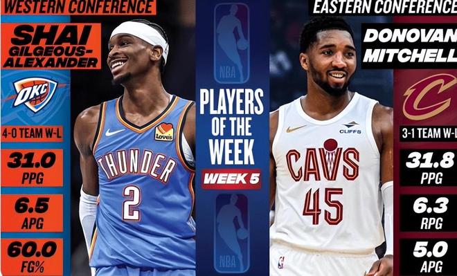 NBA迎来超级比赛日,进行了10场常规赛的较量,诞生了多位日最佳球员的提名。在这轮比赛开始前,NBA官方还公布了最新一期的球队战力榜,以及上周周最佳球员。球队战力榜上面,排名前三的都是西部球队,也算是实至名归,分别是雷霆、掘金和火箭,真的就是看起来最强的3支队伍;其中雷霆找不到什么短板,目前战绩17胜1负,火箭和掘金还多多少少都有些弱点。 东部战绩第一的活塞在战力榜排名第4,骑士第5、湖人第6。其中,骑士球星米切尔和雷霆球星亚历山大,分别荣获上周东部和西部的最佳球员。