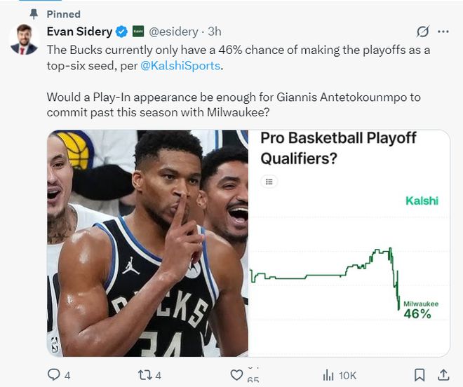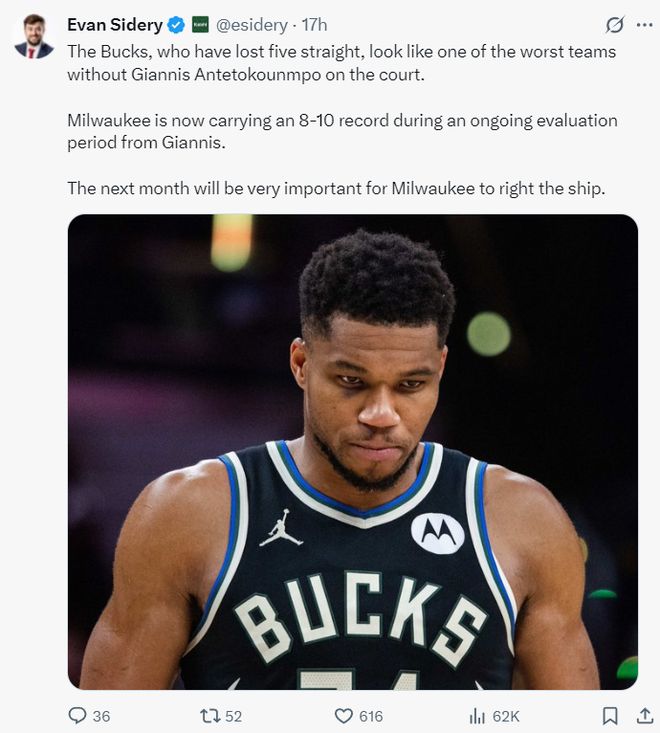 北京时间11月26日凌晨,埃文-斯迪瑞再度发文,根据KalshiSports 的数据。目前排名东部第九的雄鹿进入东部前六的概率只有46%(不打附加赛)。如果扬尼斯在季后赛中再登场一次这是否足以让他决定留守密尔沃基呢?