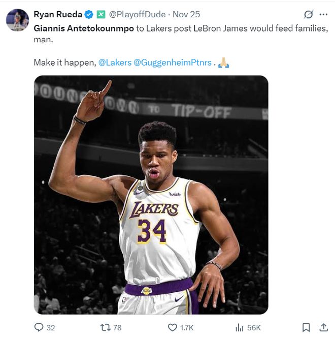 湖人记者Ryan Rueda已经开始畅想扬尼斯未来离队的情况,他写道:扬尼斯加盟湖人队后可以完美取代勒布朗-詹姆斯的位置,将帮助这支球队度过很多难关,伙计们让这一切实现吧。 |