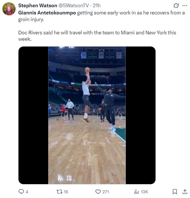 根据道格-里夫斯的说法,扬尼斯在腹股沟受伤的初期就已经开始恢复日常训练,接下来雄鹿的客场之旅(热火、尼克斯)字母哥也会随队,根据Shams的报道扬尼斯是腹股沟一级拉伤,恢复时间是1-2周。
