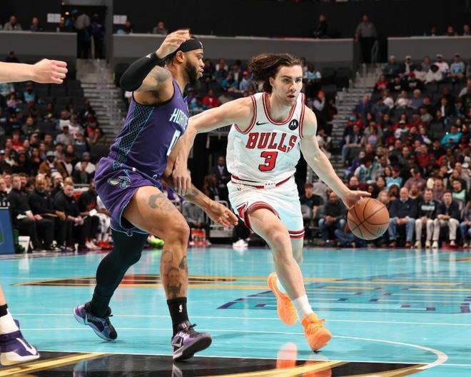 数据统计 公牛:吉迪25分11板9助、怀特25分2板4助、琼斯16分4助5断、武切维奇13分14板3助。 黄蜂:米勒27分5板1助3帽、布里奇斯22分8板7助2帽、塞克斯顿21分4板3助2帽、三球16分7板8助2断、克尼佩尔12分5板4助。 比赛回顾 公牛上一场客场130-143输给鹈鹕,黄蜂过去7场遭遇7连败。本场黄蜂缺少格林、格威与康诺顿,公牛缺少科林斯、奥科罗等。首节开局公牛5-9落后,公牛打出一波13-6攻势反超3分,双方之后继续紧咬比分缠斗。黄蜂最后阶段追反超比分,首节结束公牛29-32落后黄蜂。首节公牛25中12不足5成准星,其中三分8中2,黄蜂24中13超过5成准星,其中三分10中4。