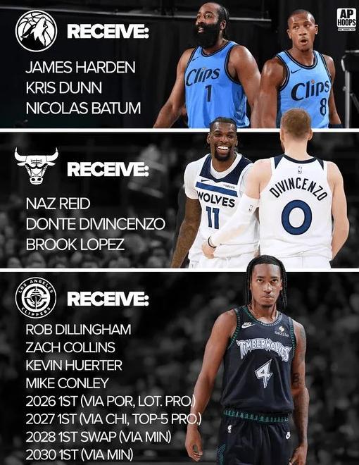 森林狼得到哈登,邓恩和巴图姆,公牛获得里德,迪文琴佐和洛佩兹,快船获得蒂林厄姆,柯林斯,赫尔特,康利,外加26年和27年首轮,还有28年首轮互换和30年首轮! 在这次交易中,快船以哈登为核心,换来几个首轮签,和一些年轻球员,但事实是即便哈登现在依旧能打球,而且打得不错,考虑到哈登的年龄,他根本不值这个价格。
