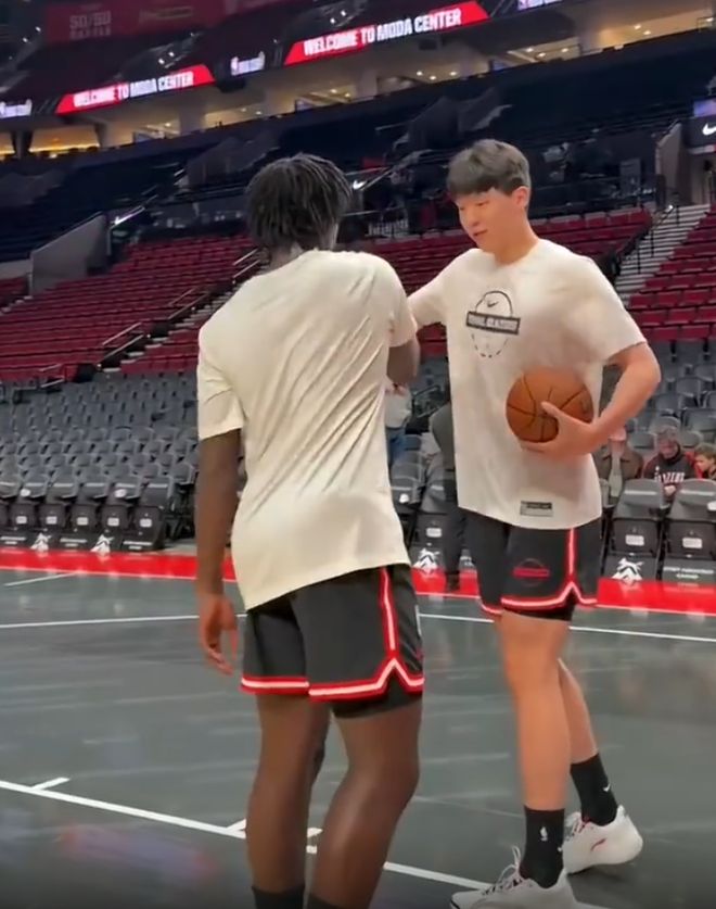 开拓者官方赛前晒出杨瀚森在主场训练备战马刺的视频。