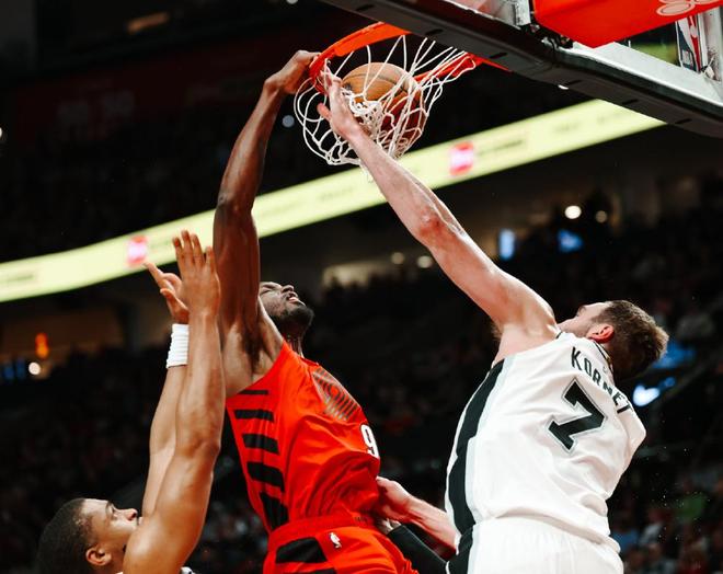 非常清楚福克斯是如今这支马刺唯一战术核心的开拓者,首节一上来的防守策略就非常明确,那就是坚决不给福克斯轻松出手的机会,但不得不说缺少了冠军后卫霍勒迪,开拓者的单防能力并不是非常强,这也让福克斯面对严防死守,仍然半场打出了14+2+5+1+1的全面表现,在他的率领下,马刺也带着2分的优势,回到了中场更衣室。 重新回到赛场之后,开拓者仍然对福克斯没有太好的办法,一对一单防时,后者总是能够利用十八般进攻武器找到得分的办法,而一旦夹击,小狐狸的传球也非常犀利,四节战罢,福克斯凭借25次出手命中11球的发挥,贡献了37分、6个篮板、8次助攻、2次抢断和1个封盖的全面个人数据。