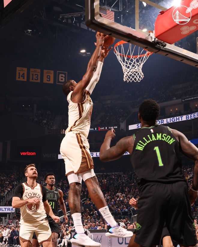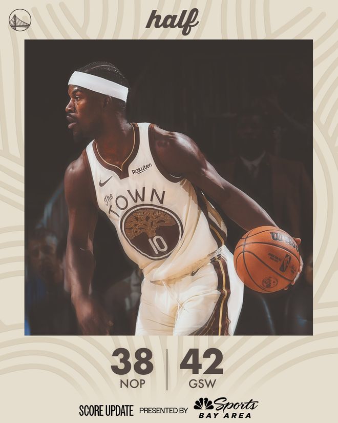 勇士队的佩顿上半场得到12分和5个篮板,巴特勒得到11分、6个篮板和5次助攻;鹈鹕队的锡安得到6分。 双方在第三节开始后你来我往,比分交替增加,勇士队外线手感回暖,波兹姆斯基和穆迪各中三分,本节过半时他们以61-55领先。贝连投带罚回敬4分,阿尔瓦拉多也命中三分,鹈鹕队连追7分再次反超。希尔德挺身而出连中2个三分球,勇士队重新领跑。鹈鹕队又追3分,巴特勒连进两球,锡安强攻连造犯规,四罚三中,米西两罚一中,三节结束时鹈鹕队以72-73落后1分。