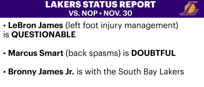 北京时间11月30日,湖人更新了明天对阵鹈鹕的伤病报告,詹姆斯(左脚伤病管理)被列为出战成疑(上场可能50%),斯马特(背部痉挛)是大概率缺阵(上场可能25%),布朗尼下放发展联盟,确定不会出战比赛。