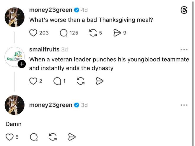 一名网友回复道:“一名老将领袖球员给了队中的青年才俊一拳并毁掉了这支球队的王朝。” 追梦回复道:“Damn.(我靠)” 勇士队在2022年夺得总冠军,这也是他们8年内的第4座总冠军。但在当年的休赛期,追梦在一次训练中与普尔发生冲突,他直接给了普尔一拳。更严重的是,这段视频被公布到了网上引起轩然大波,普尔也在一个赛季后被交易离队,而追梦则完成了续约。勇士队也已经连续3个赛季没有夺冠。 |