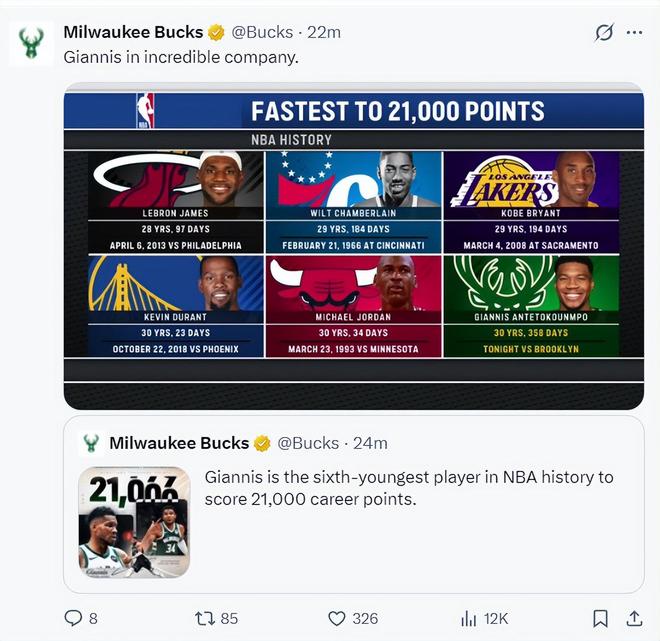 雄鹿官方晒图:扬尼斯30岁358天拿到21000分历史第六年轻,仅次于詹姆斯28岁97天,张伯伦29岁184天,科比29岁194天,杜兰特30岁23天,乔丹30岁34天。