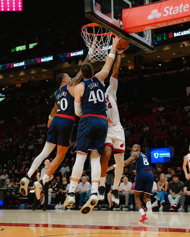 热火队的阿德巴约上半场得到14分和7个篮板,维金斯得到13分和7个篮板,鲍威尔得到13分;快船队的哈登和莱纳德各得到11分,祖巴茨得到10分和7个篮板,邓恩得到10分。 第三节开始后热火队攻势不减,阿德巴约、米切尔和鲍威尔命中4个三分球,一波12-0的小高潮让他们领先32分。快船队暂停后换下主力,布朗突破暂时止血,两队之后交替得分,阿德巴约又拿5分,本节还有4分45秒时热火队以105-69领先。保罗三分还击,鲍威尔和维金斯联手5分,莱纳德回应两记三分,希罗跳投命中,三节结束时热火队以114-82领先。